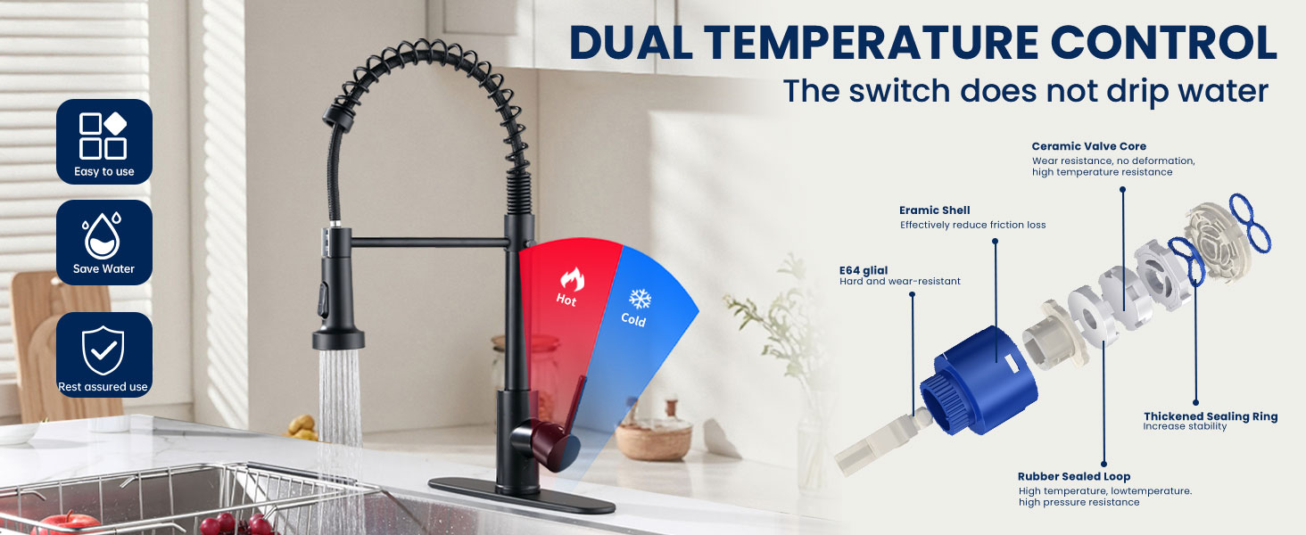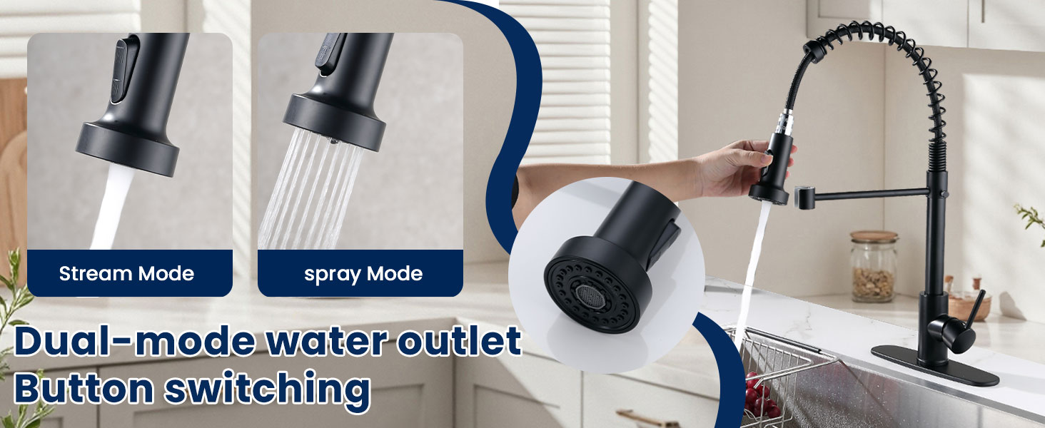 - DUAL MODE SETTING - Your kitchen faucets with pull down sprayer provides soft aerated stream and splash-free powerful spray due to its hard rubber sprayer holes. 360 degree kitchen sink faucets sprayer, the switch can be placed in every position as you like.