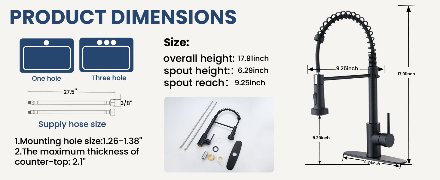 - SPECIFICATIONS - Spout reach 9", spout height 5", overall height 18.5". Maximum Deck Thickness: 2.5", Pre-drilled hole size requirement: 1.38"--1.5". Pull out the hose 17.7" easily reach any position of the sink.