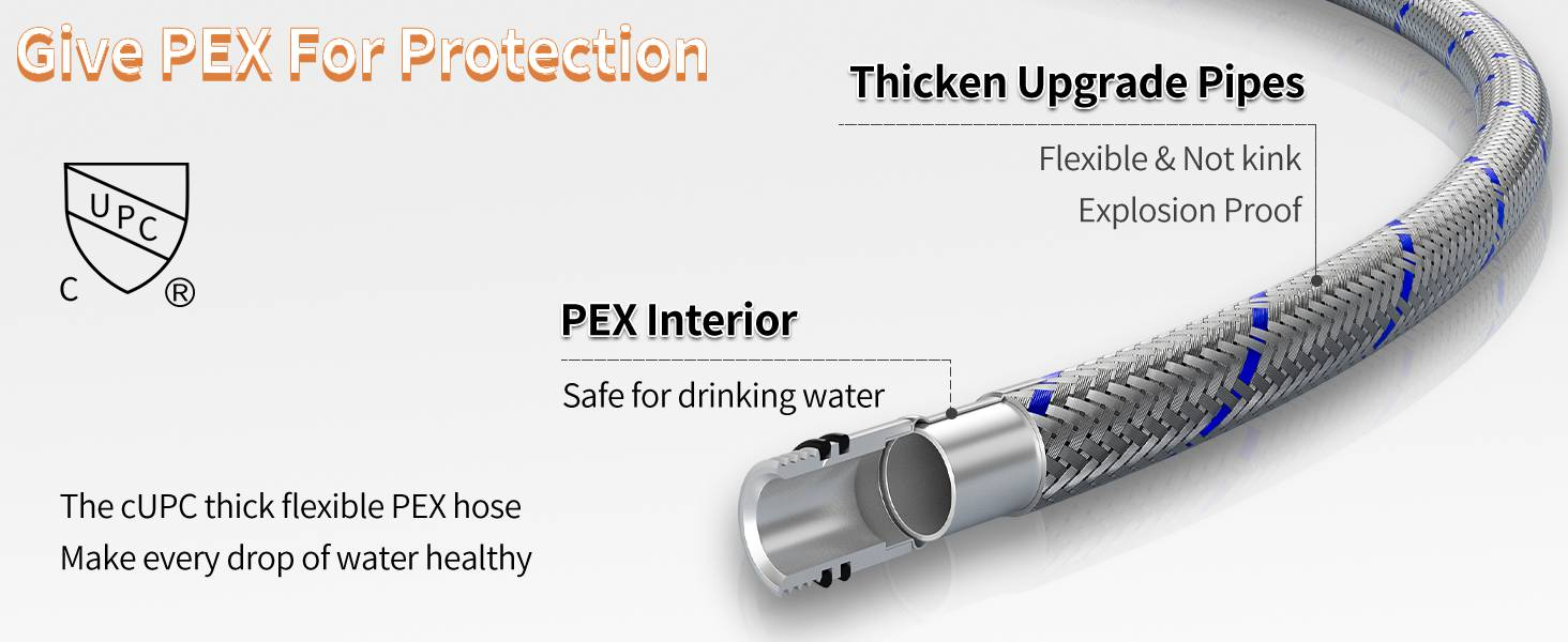 - cUPC -BESy integrated InnoFlex PEX supply lines are be wrapped by 24" braided Flexible supply lines, explosion-proof and high temperature.3/8 Designed for use with standard U.S. plumbing connections, built-in rubber ring effectively avoids water leakage.