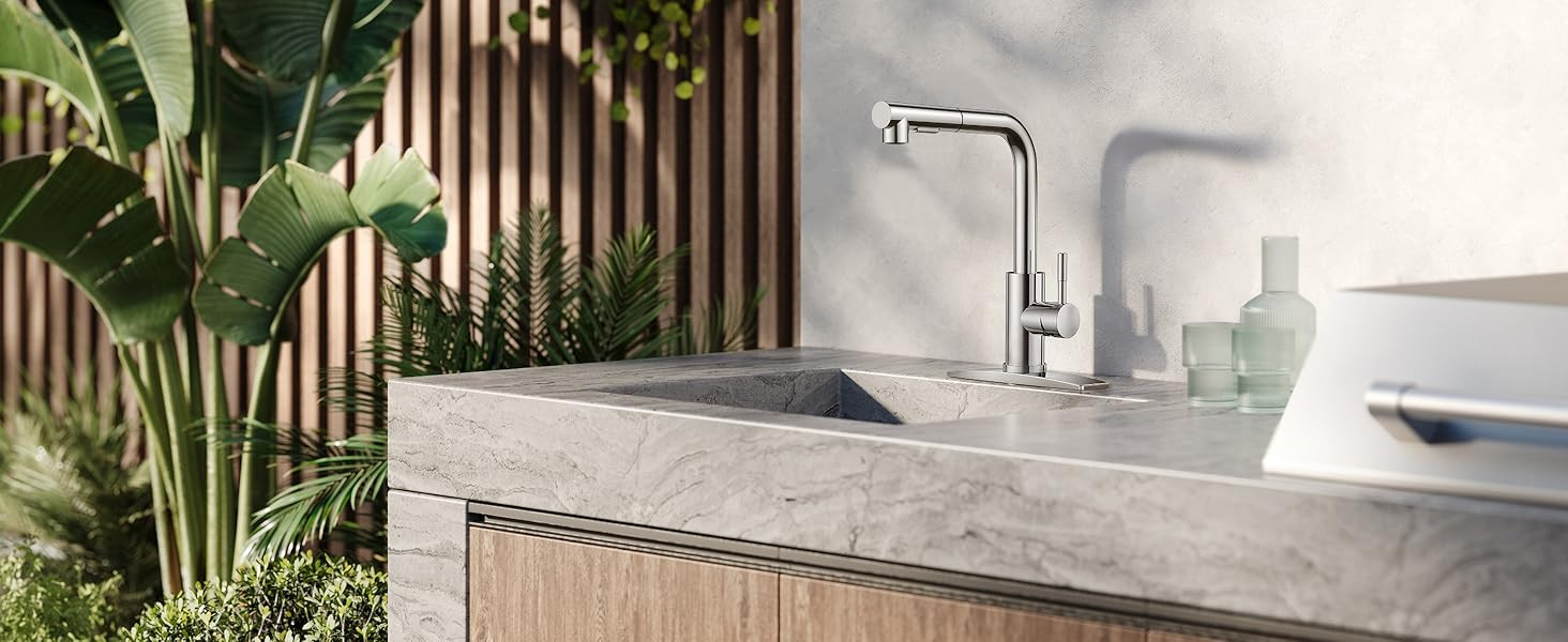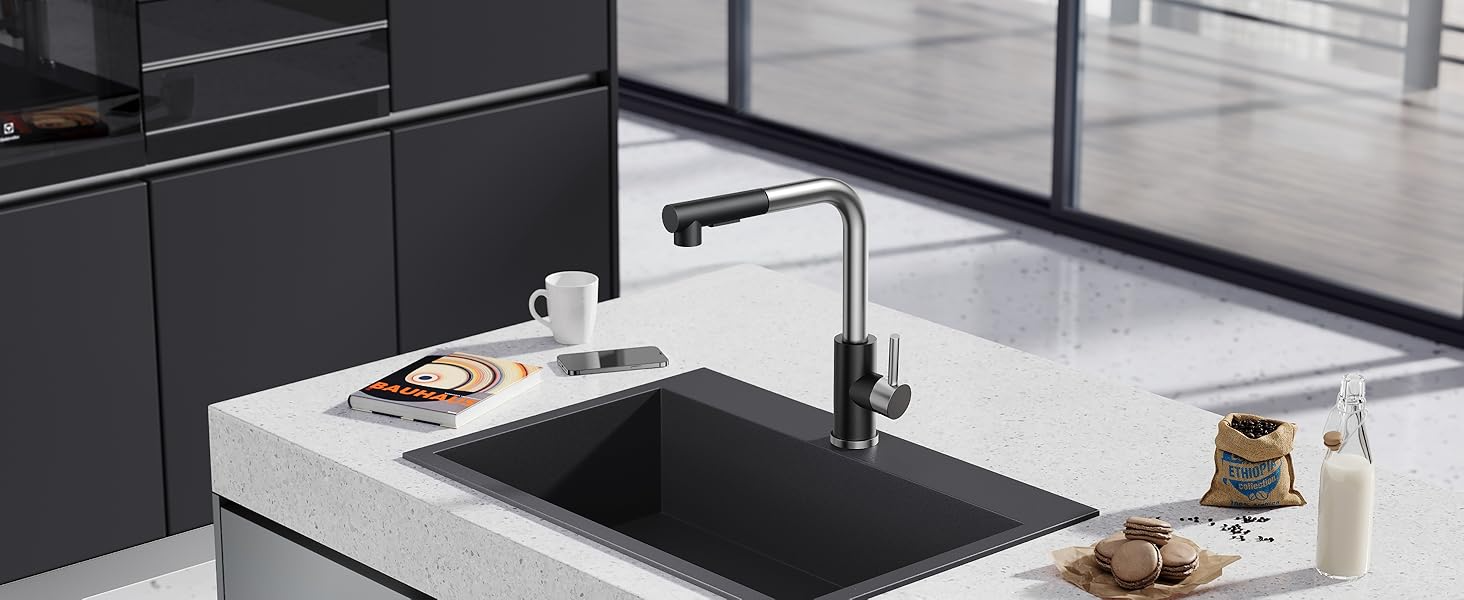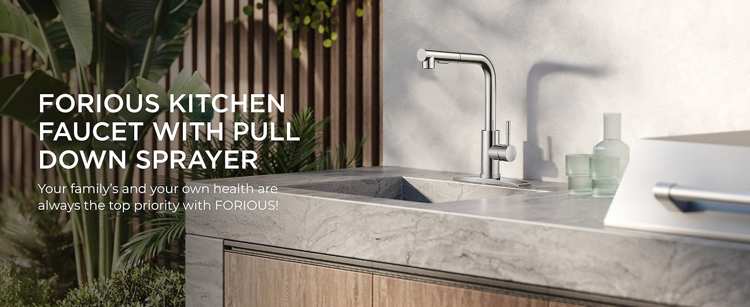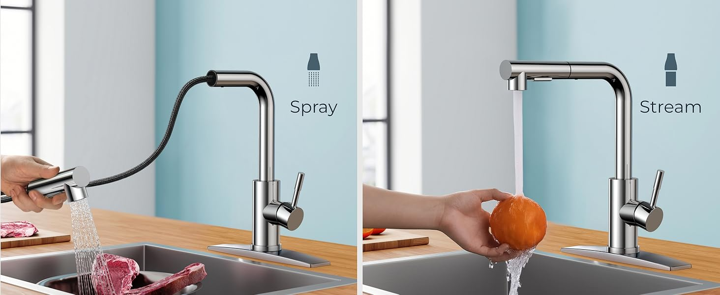 - Versatile Control: Our kitchen faucet with pull down sprayer offers tailored water flow with two modes: Stream and Spray for everyday tasks, and a single handle for precise control over temperature and volume