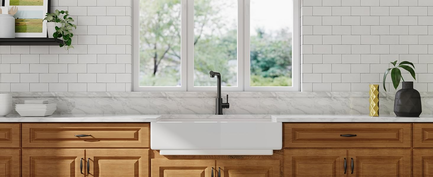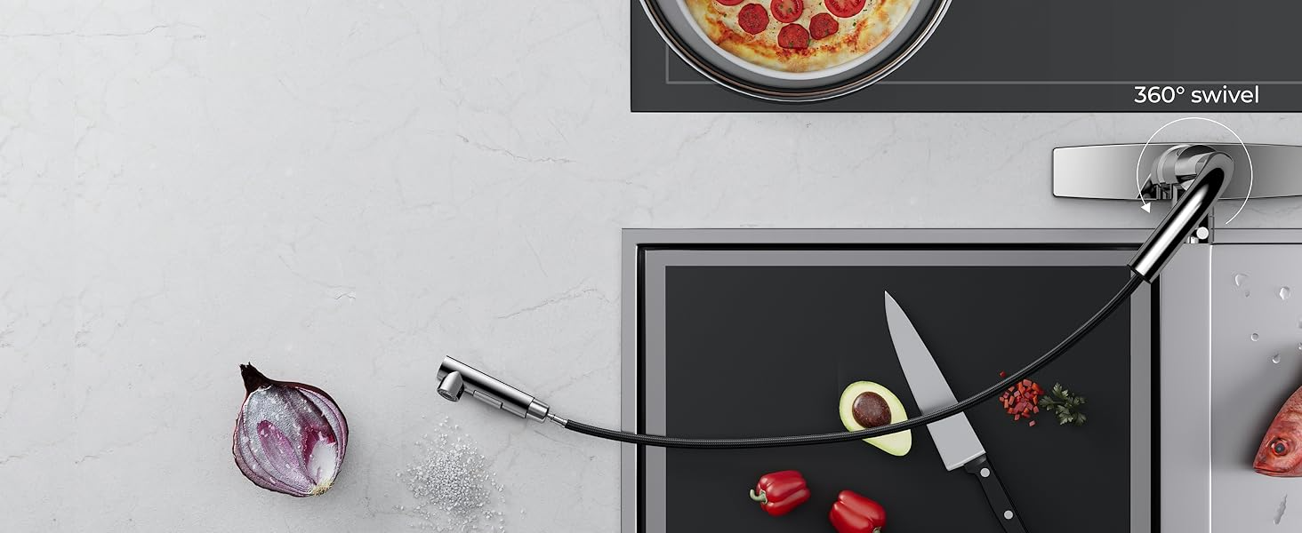 - Modern L-shaped Design: The kitchen faucet with an L-shaped spout emphasizes the straight lines of the design, and complete with an 18-inch retractable hose and a 360° rotating sprayer, offers ample reach at your kitchen workstation sink