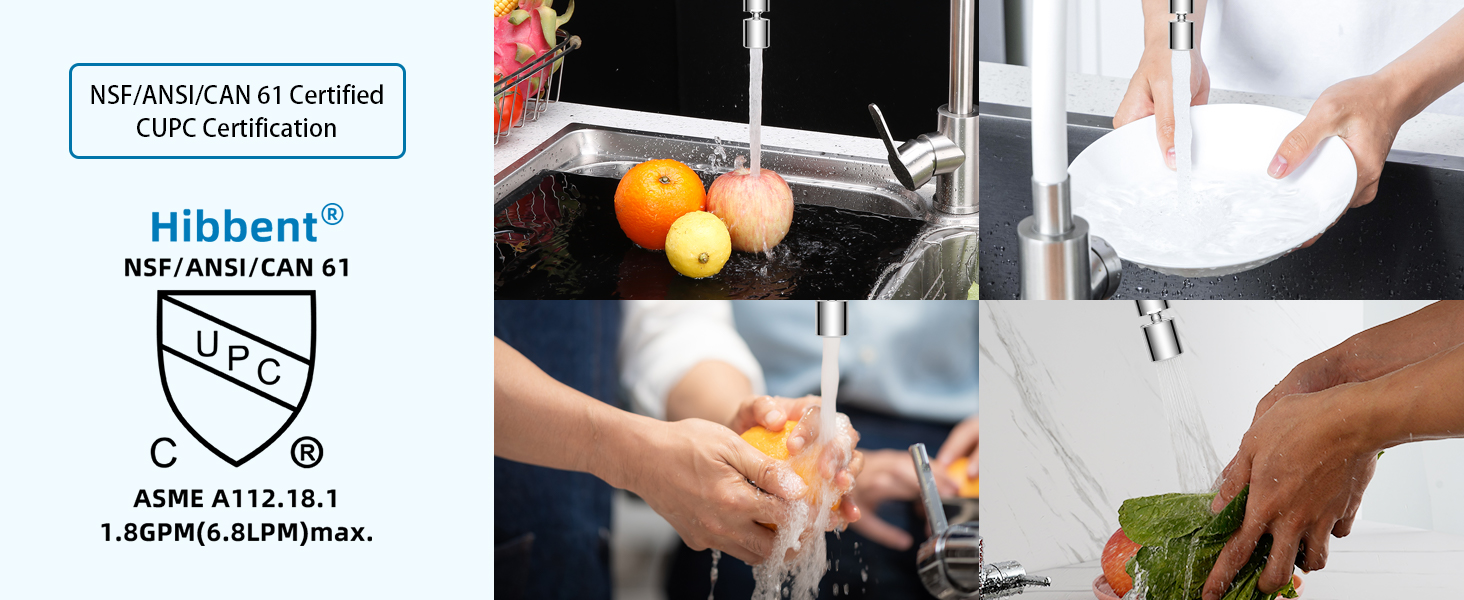 This kitchen faucet aerator has NSF/ANSI/CAN 61 Certification and is endorsed with CUPC Certification by Hibbent