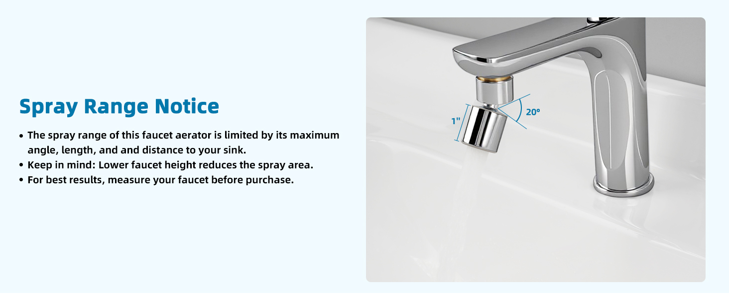 Extended Rotation Angle: The upgraded 20-degree rotation angle allows water flow to reach more sink corners, boosting convenience for washing and cleaning. Note that lower faucet heights result in smaller spray ranges. To ensure suitability, we recommend confirming the 20-degree angle and expected water flow range meet your needs before purchase