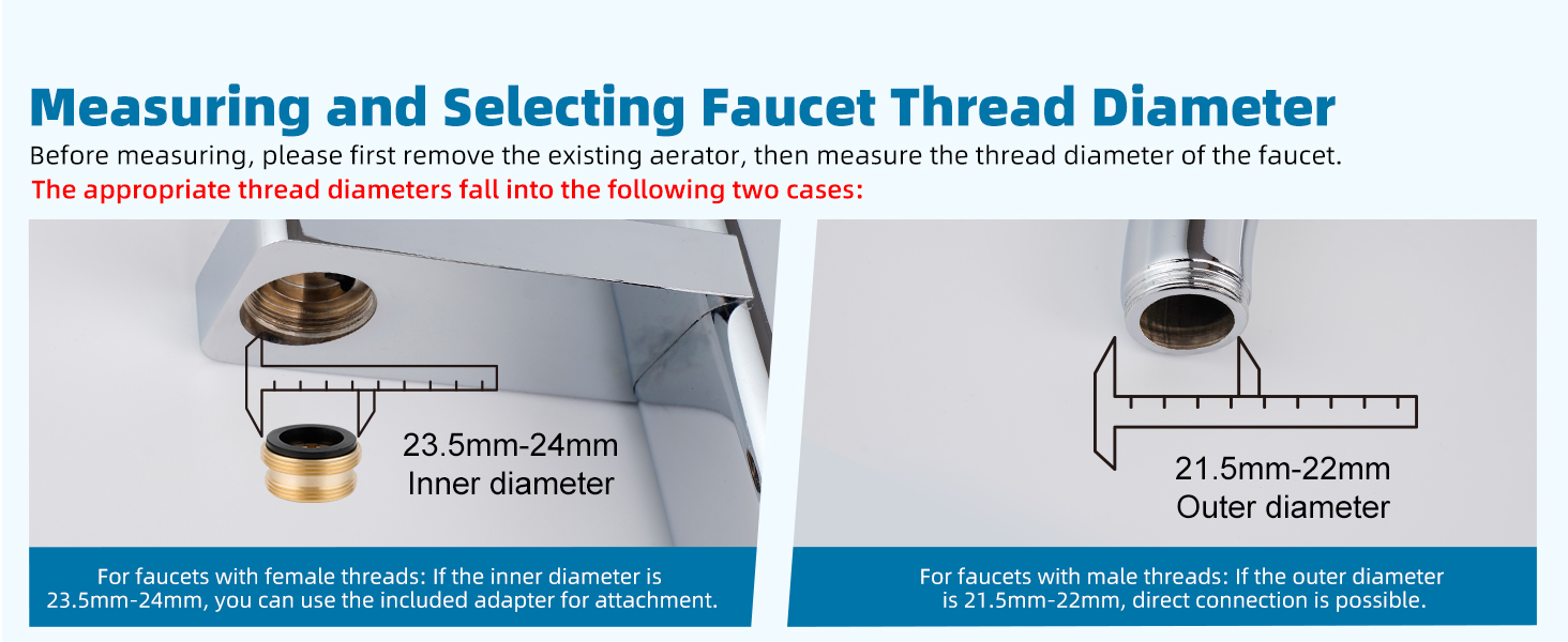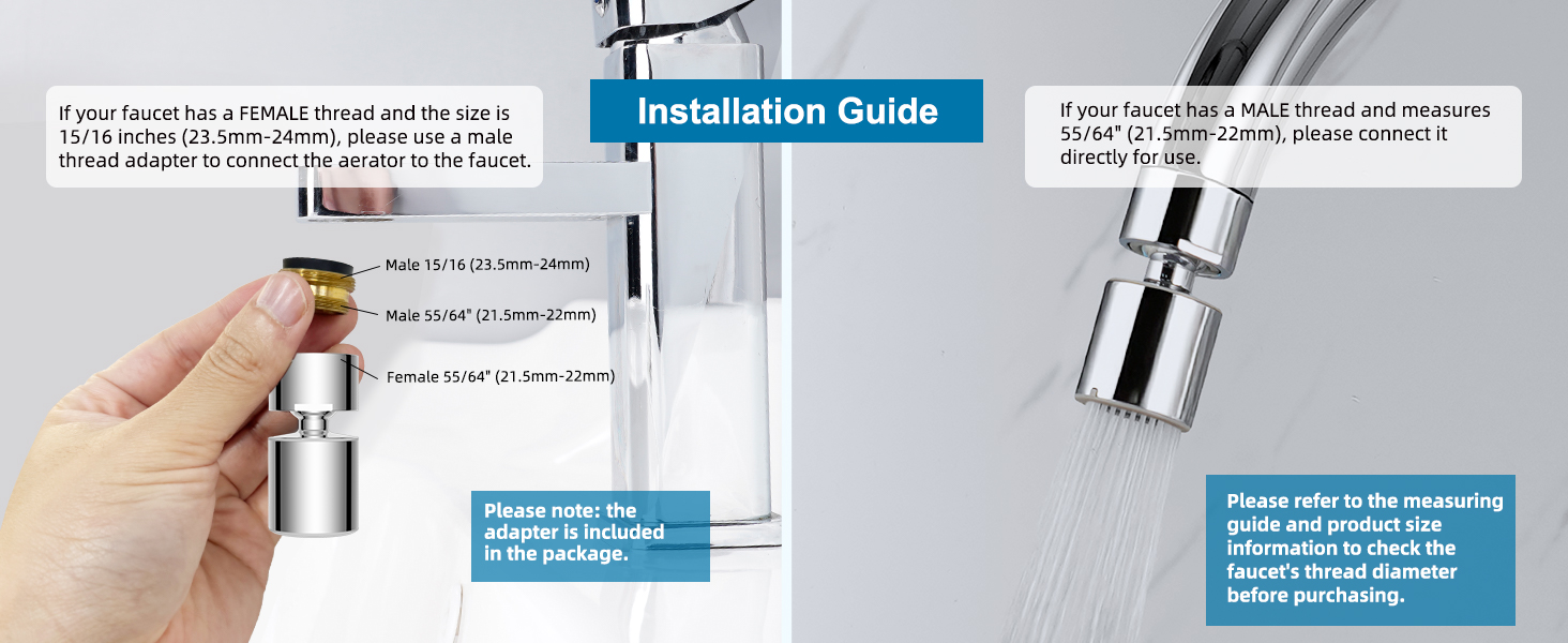 Easy to Install: The kitchen faucet aerator extender features a female thread (55/64 inch) that fits male-threaded faucets. For female-threaded faucets, you can use the included female-to-male adapter (15/16 inch) for compatibility. We recommend measuring your faucet's thread diameter before purchase to verify it matches the required size, ensuring a proper fit