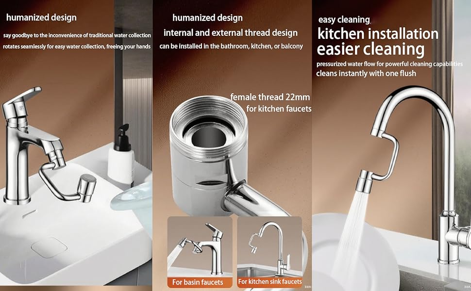【Full 1440° Rotation – Total Sink Control】 The FlexiFlow 1080° Rotating Faucet Extender features a unique 4-joint design The faucet extender for kitchen sink innovatively adopts a rotate, bend and fold360° rotation design to achieve 1080°--1440° rotation, so that any corner of the sink can be easily reached, without the effort of moving items, and rotating faucet aerator can easily cope with various scenarios