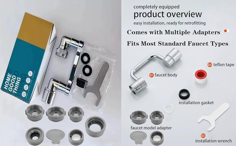 【Universal Compatibility – Easy to Install】 Adapters and washers are included in our package.The FlexiFlow 1080° sink faucet extender comes with multiple adapters and fits most standard faucet types. No tools required—just attach it in seconds and upgrade your sink instantly.
