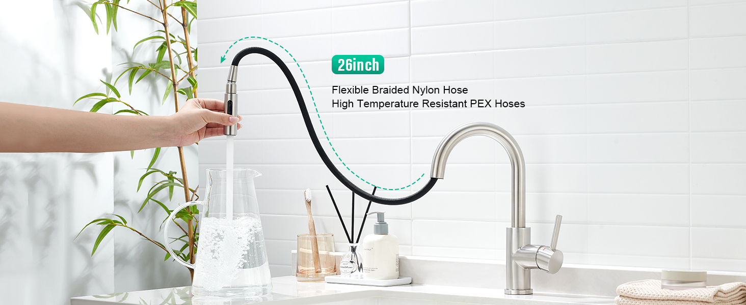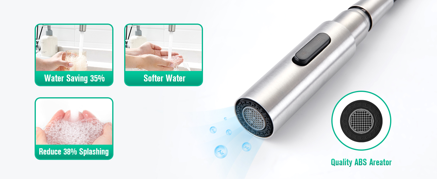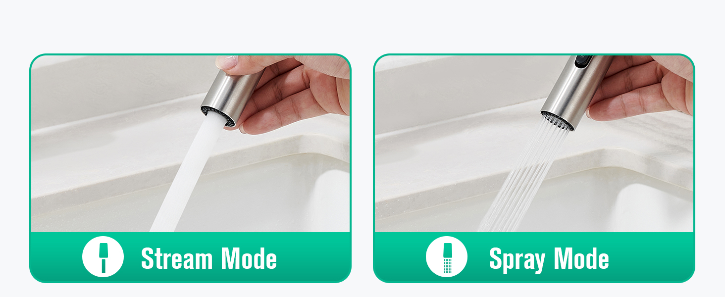 💧【Smart Sprayer Functionality】The 19.8-inch flexible pull-out wand with gravity ball design snaps back effortlessly.Control hot/cold water via a single handle,while the ceramic cartridge ensures drip-free operation tested to 500,000 cycles—ideal for busy kitchens or bathrooms