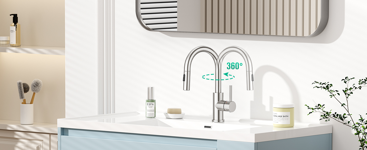 💧【Multi-Functional Faucet Design】Sadoo high arc bathroom faucet doubles as a bar sink faucet,small kitchen faucet for mini sink,or vanity faucet.Its 360° swivel pull-out bathroom faucet head offers spray/stream modes for versatile use in rinsing dishes, washing pets,or cleaning bathroom sinks with no dead angles