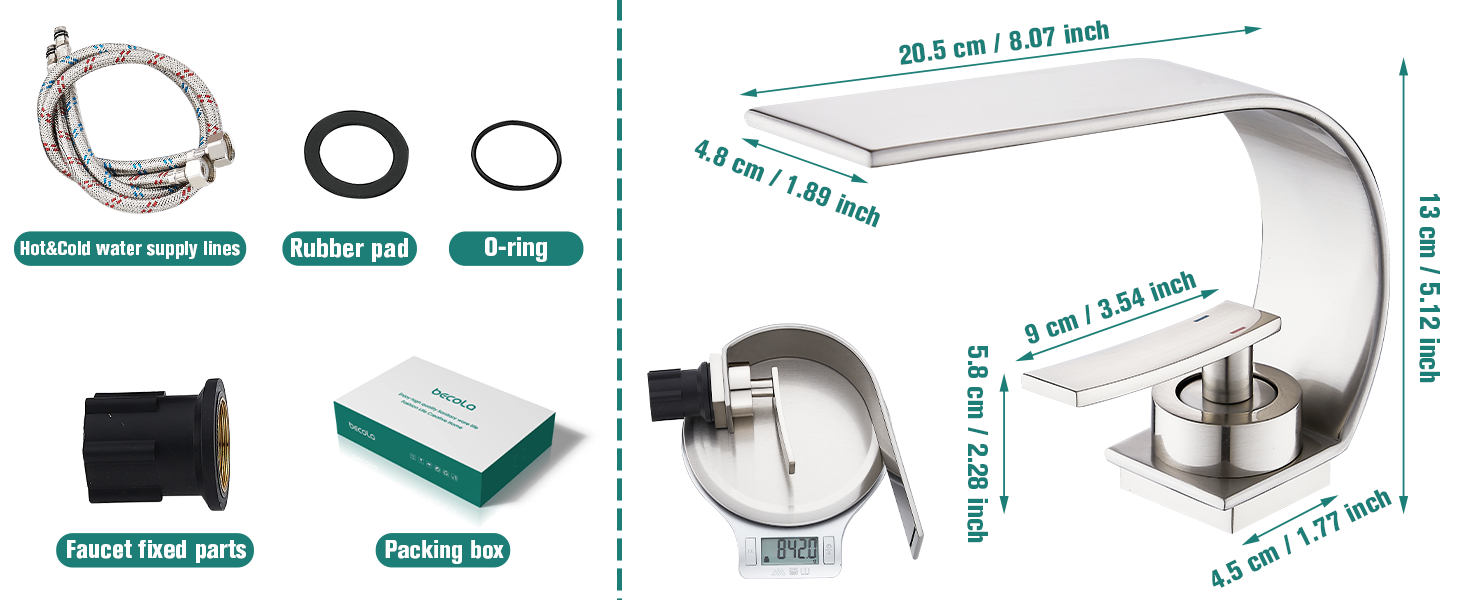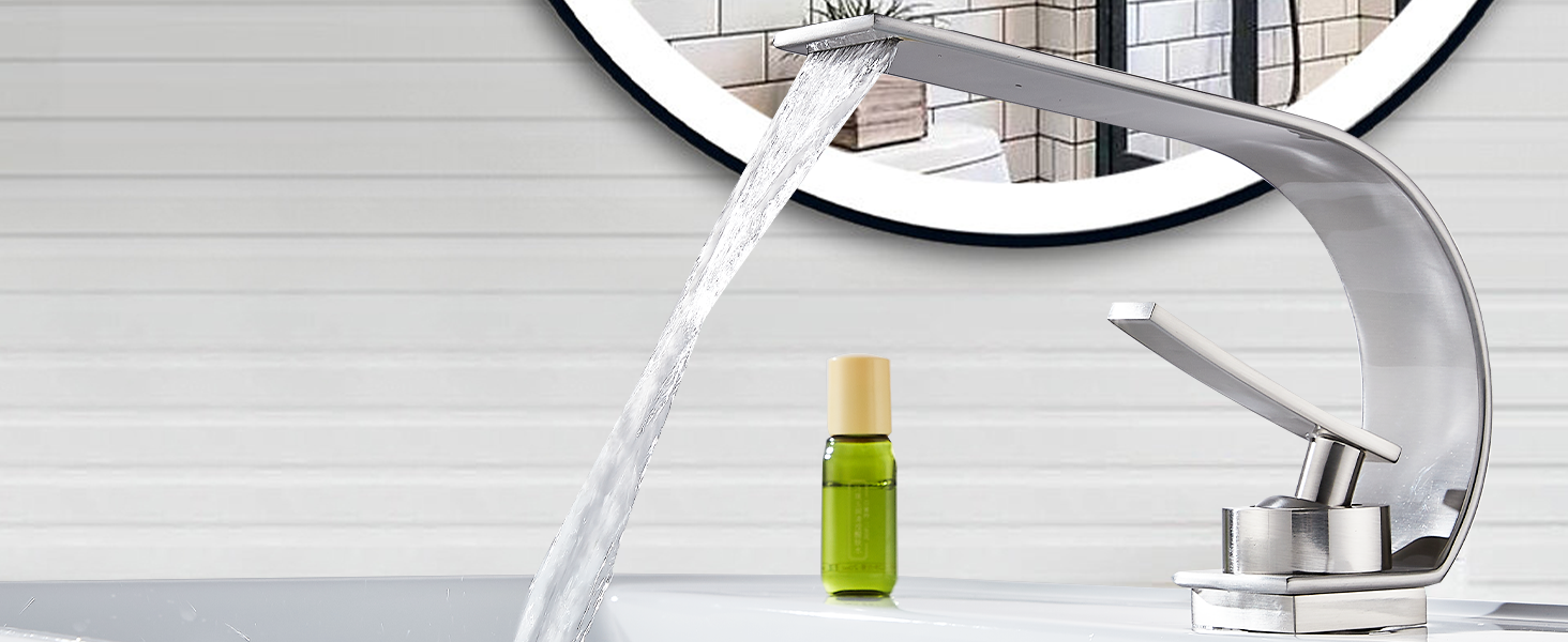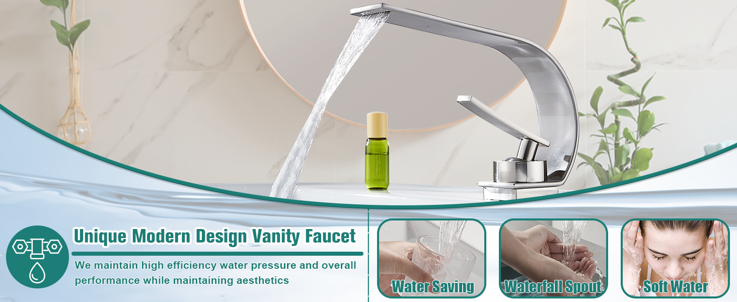 【Low-Curved Faucet Design】: Waterfall single-handle basin faucet, hot and cold water mixing, modern and unique design, exquisite fashion, curved nozzle provides more space for free cleaning, very suitable for families, high-end hotels, guesthouses, public areas .